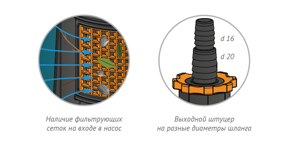 Верхнее размещение всасывающих окон снижает вероятность попадания в рабочую камеру осадка, а две встроенные сетки задерживают крупные твердые включения. Корпус защищает внутренние узлы от внешних воздействий и не подвержен коррозии, что увеличивает срок службы оборудования. Фиксация выходного штуцера накидной гайкой облегчает подключение шланга, а универсальный патрубок подходит для нескольких типоразмеров.